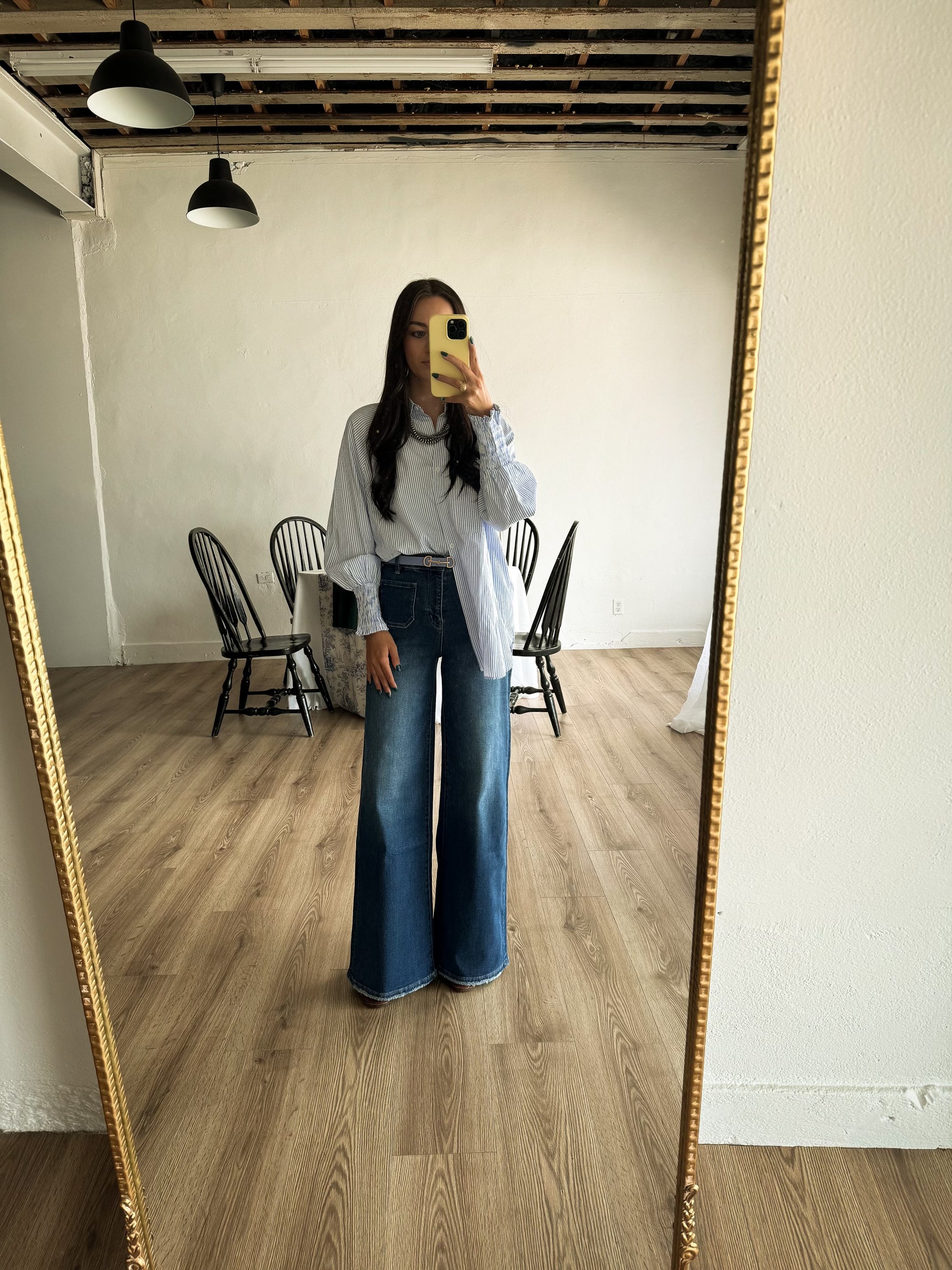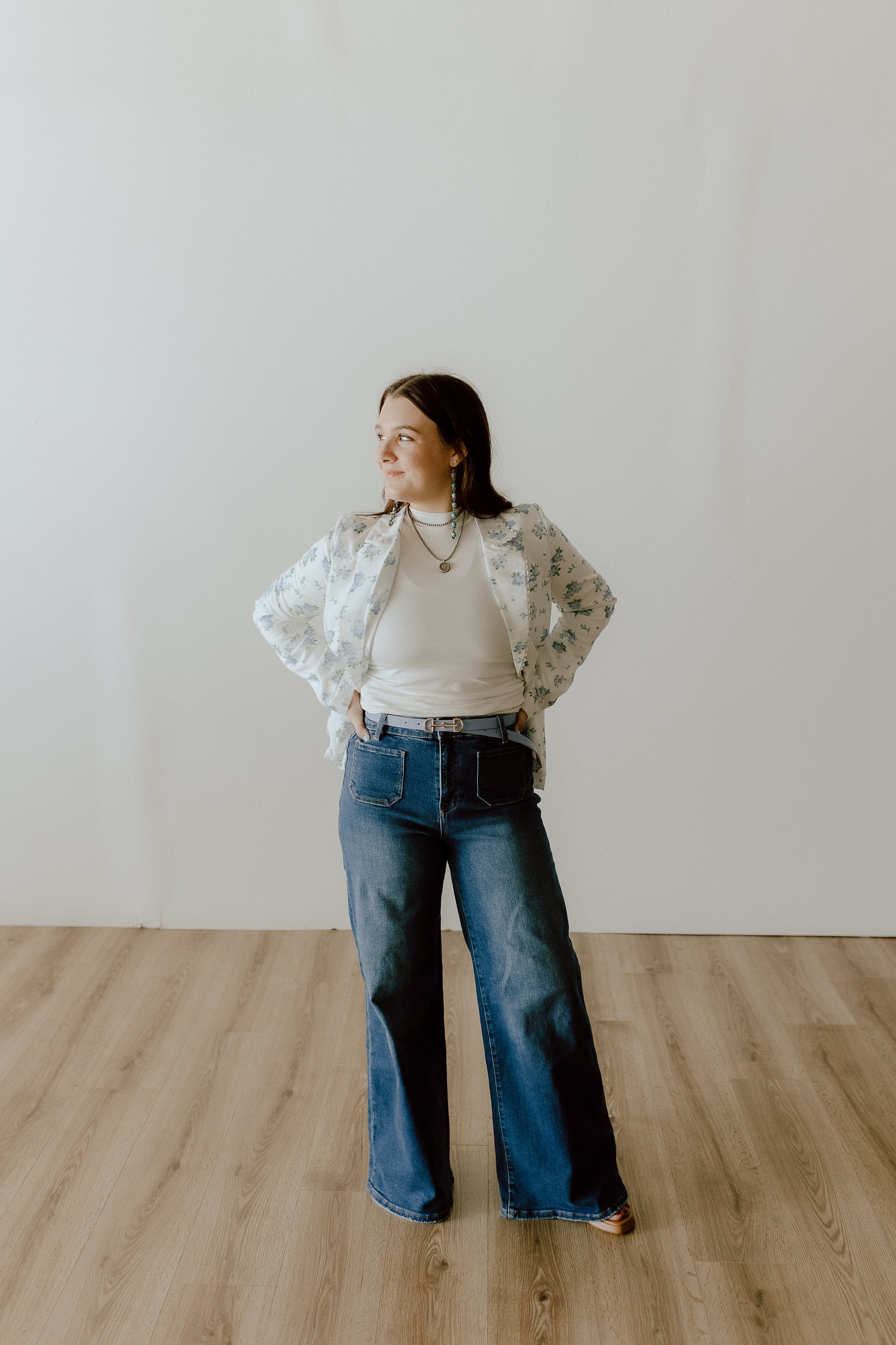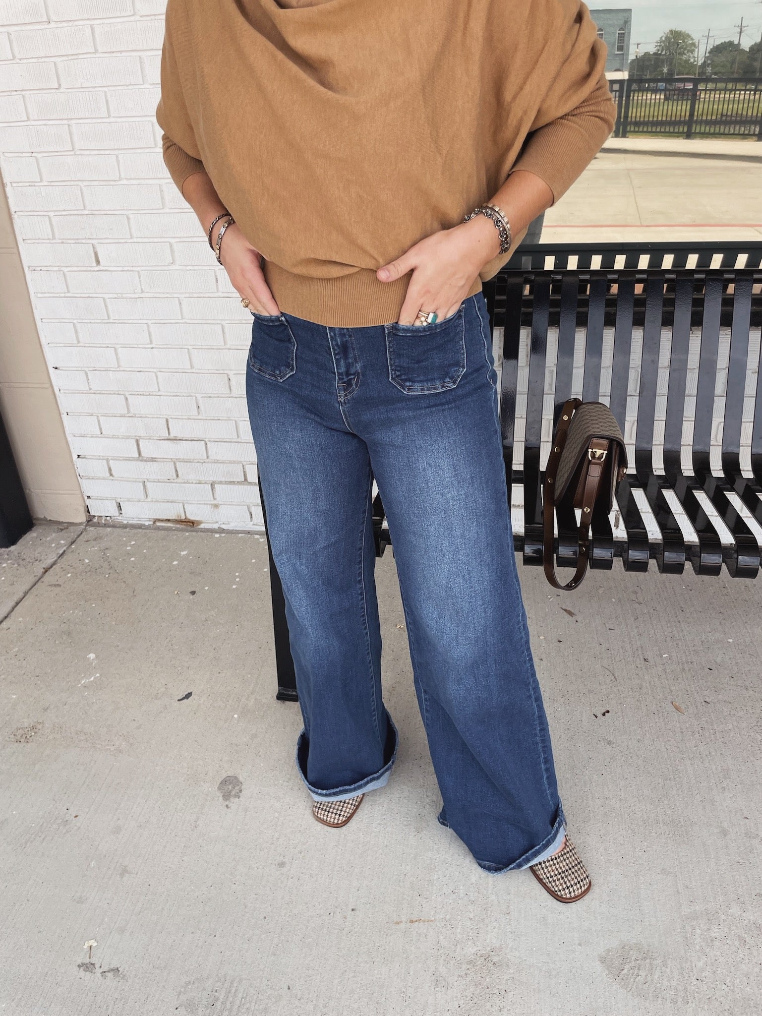 These jeans have the cutestttt front pockets! They are stretchy and very forgiving, so I wouldn't size up. High-waisted! For my shorter girls, they are a little long, but would be perfect with boots or platforms. They can be rolled easy!