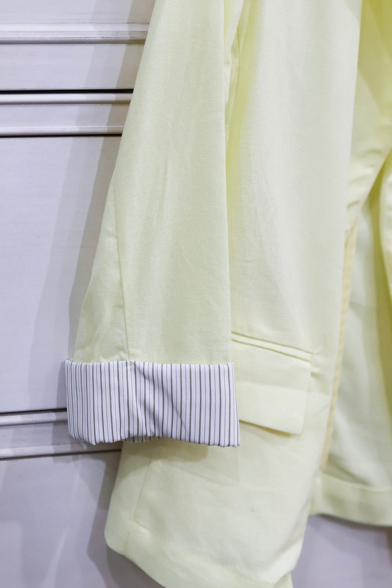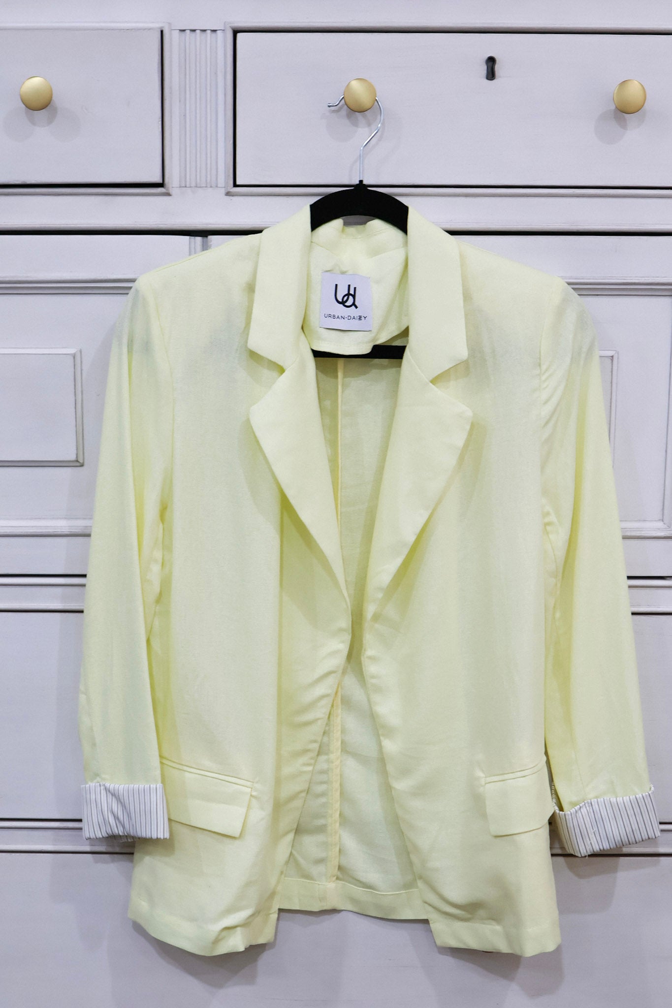 Fun yellow linen-y blazer! Has a cute stripe detailing on the sleeves!