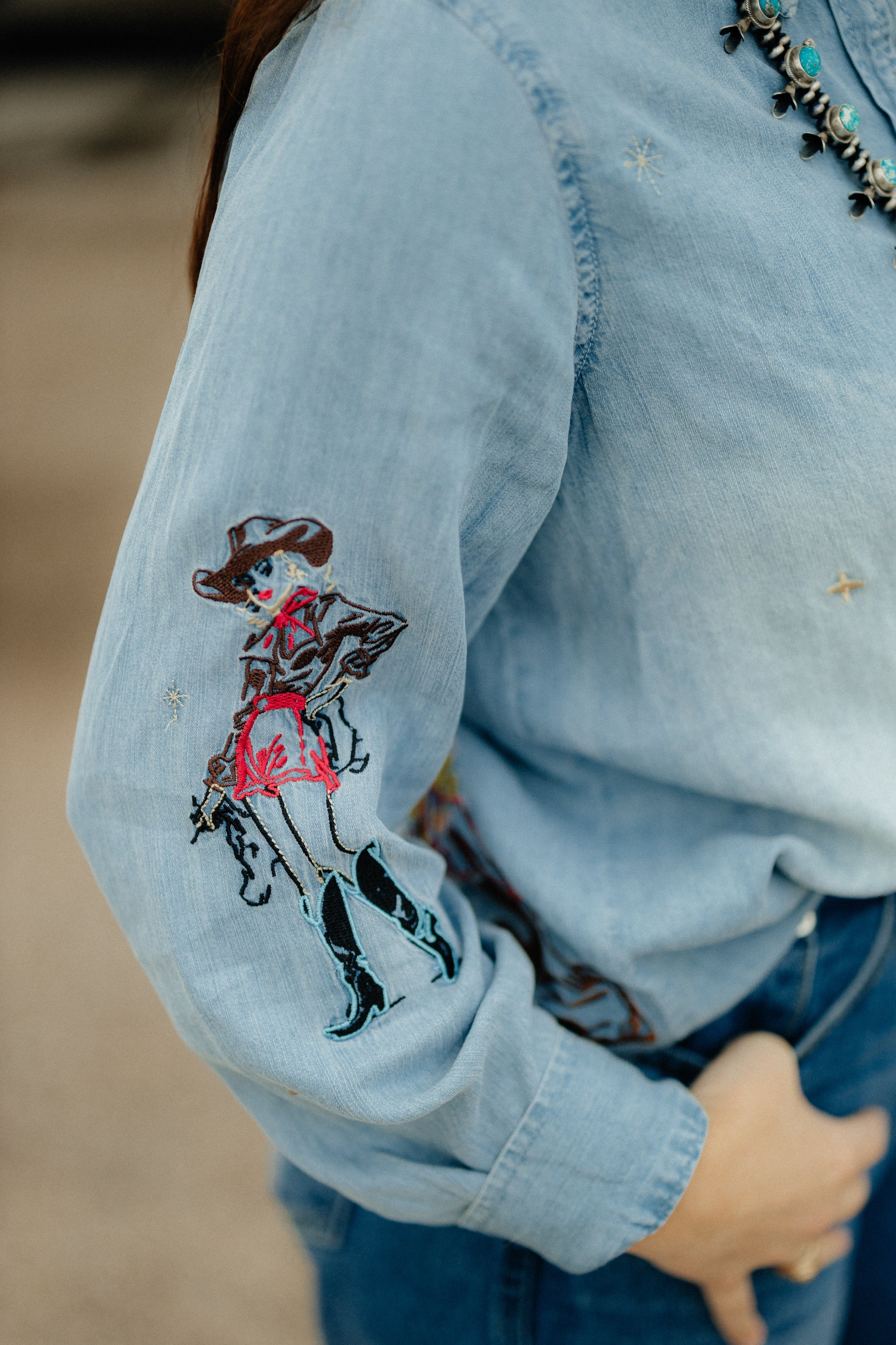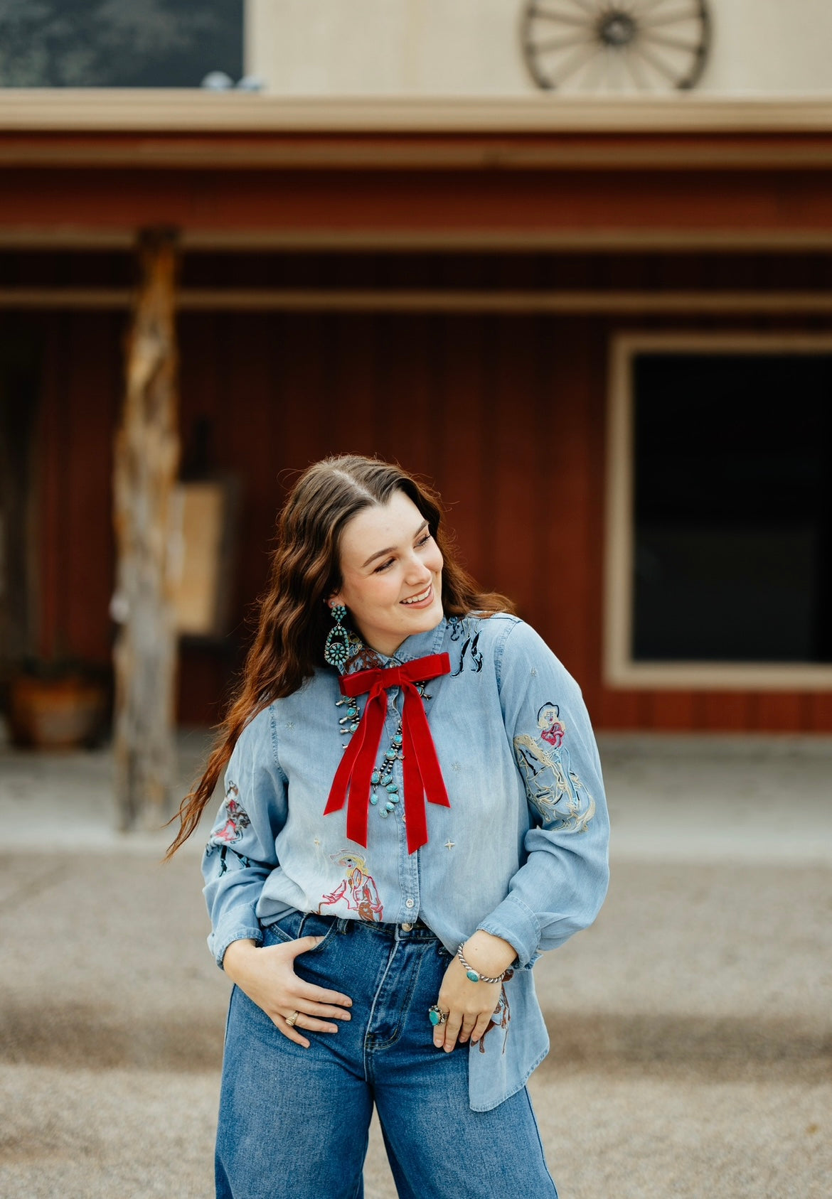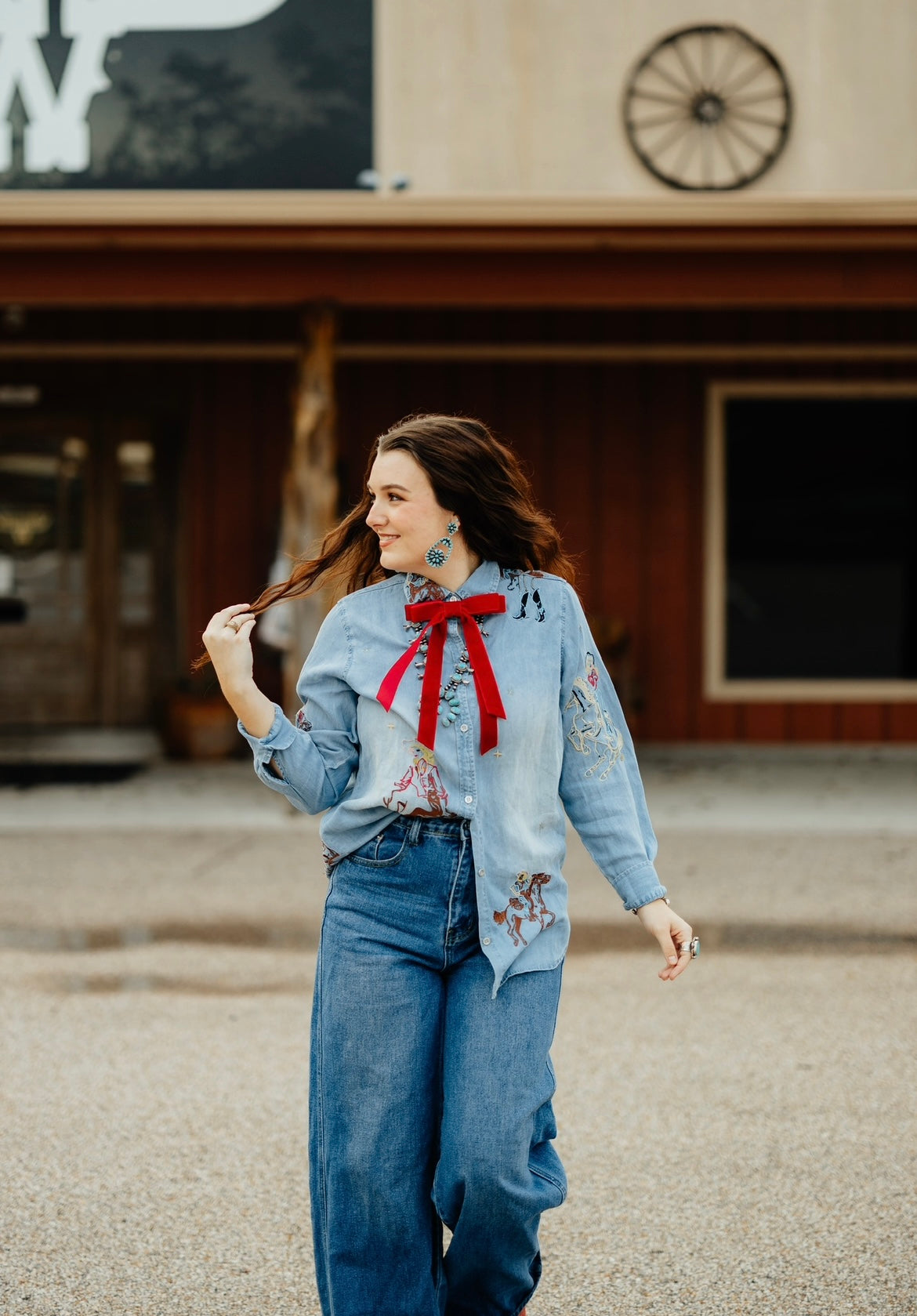 A lightweight denim shirt with the cutest embroidery all over! So cute for all the holidays because it has a little hint of red and sparkle. Love this one!