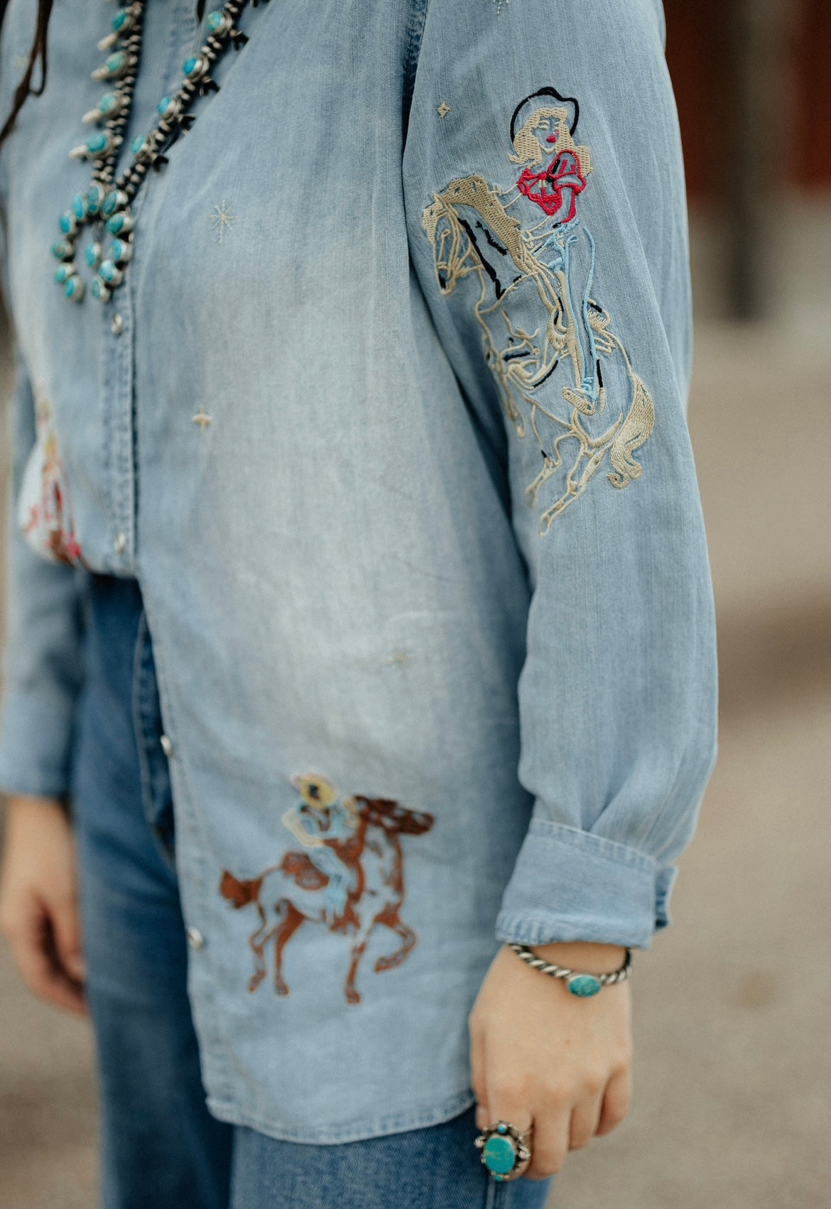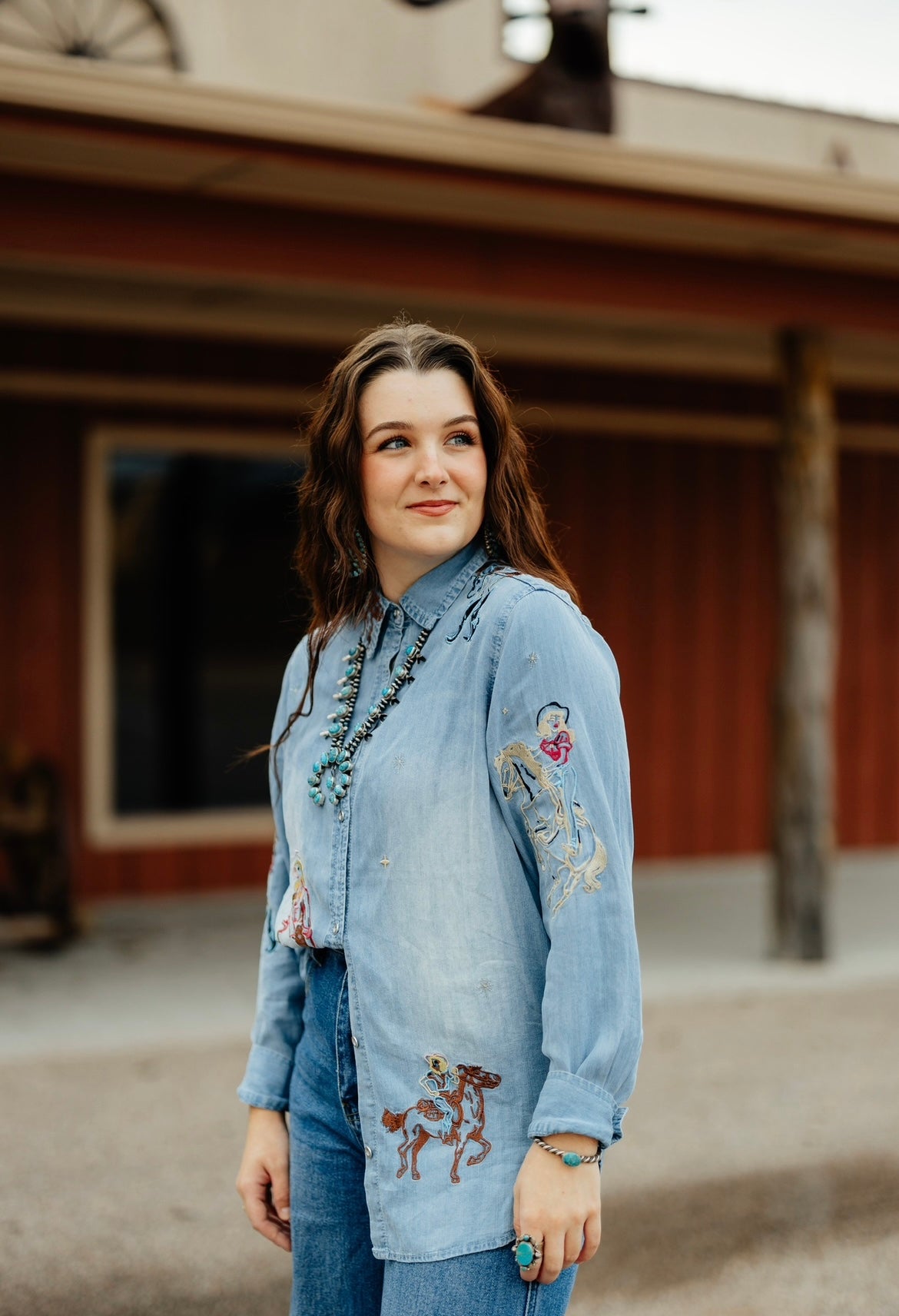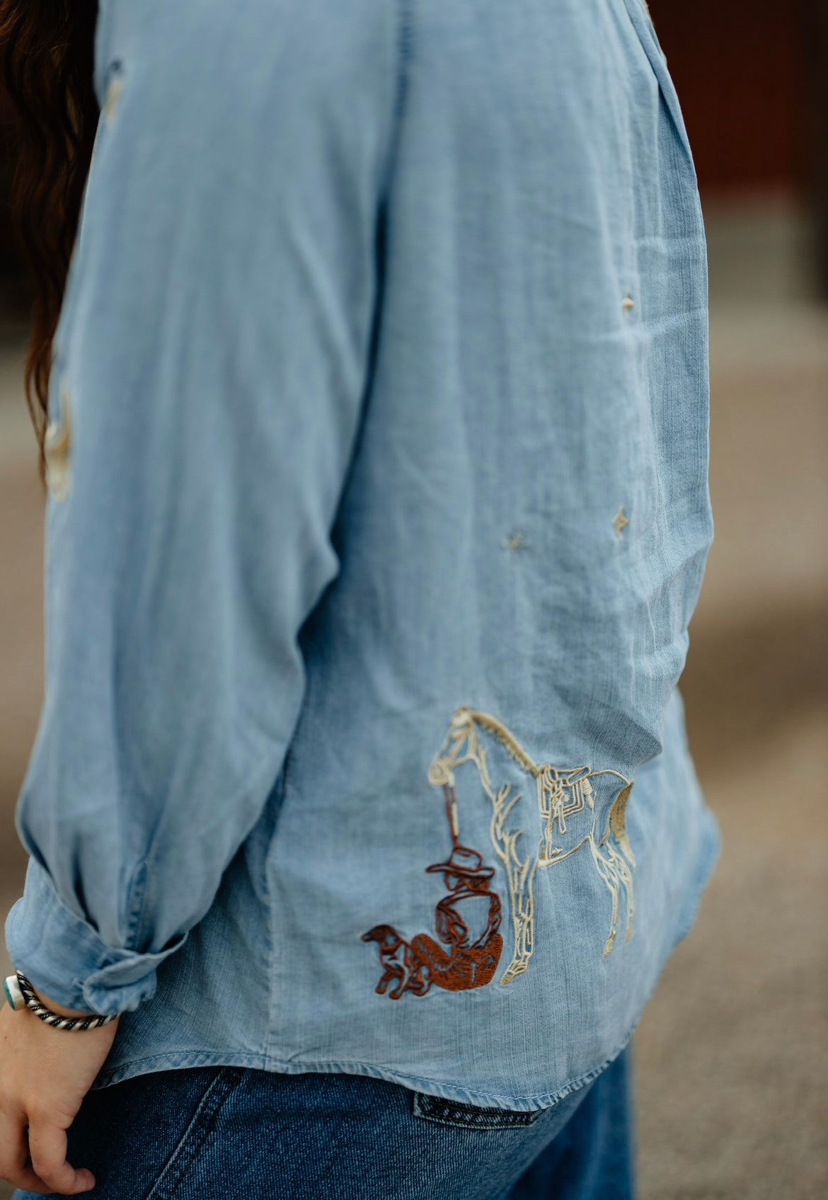 A lightweight denim shirt with the cutest embroidery all over! So cute for all the holidays because it has a little hint of red and sparkle. Love this one!