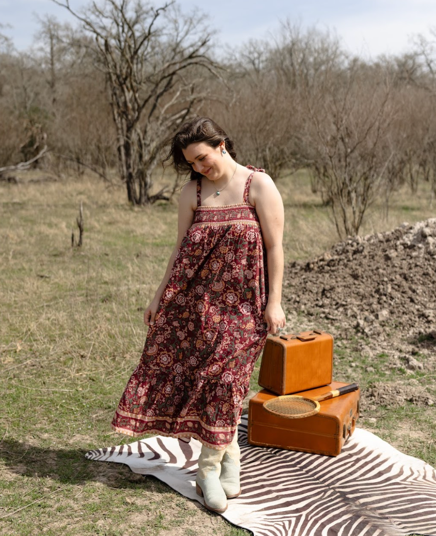 Pretty burgundy floral print dress. Adjustable tie straps and midi length!