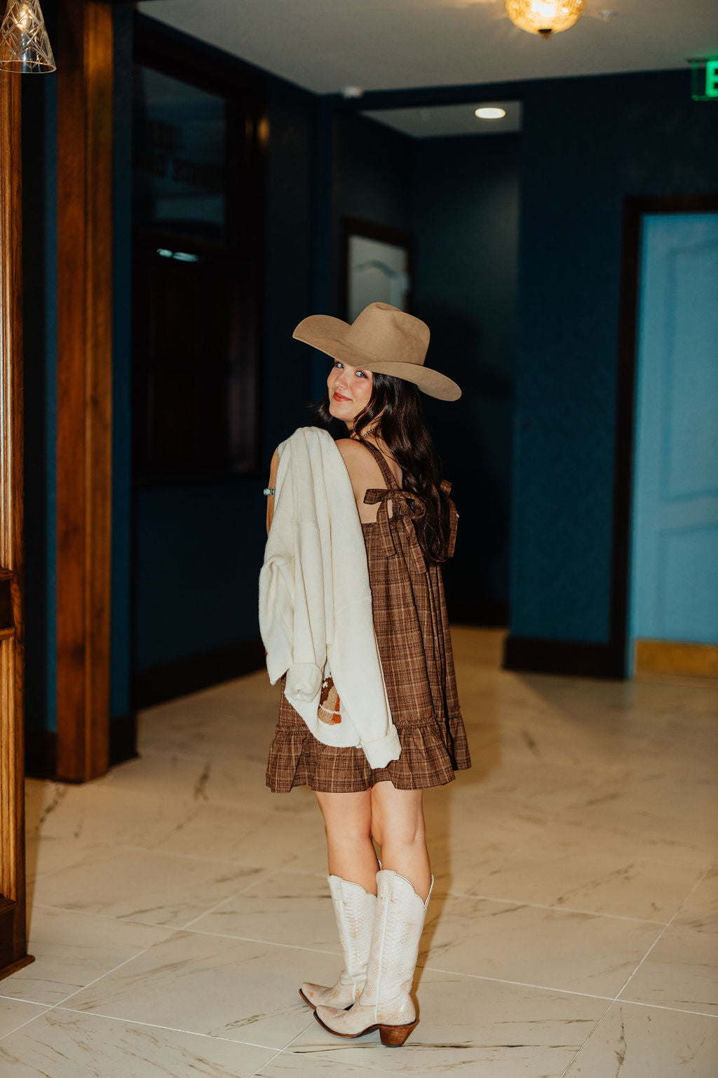 This dress is one of my favorite pieces ever! Such great quality and sooo soft! It has the cutest bows in the back and the buttons are working so it is fully adjustable to how you want to style it! It is a little on the shorter side, but you can loosen straps. It has pockets (: