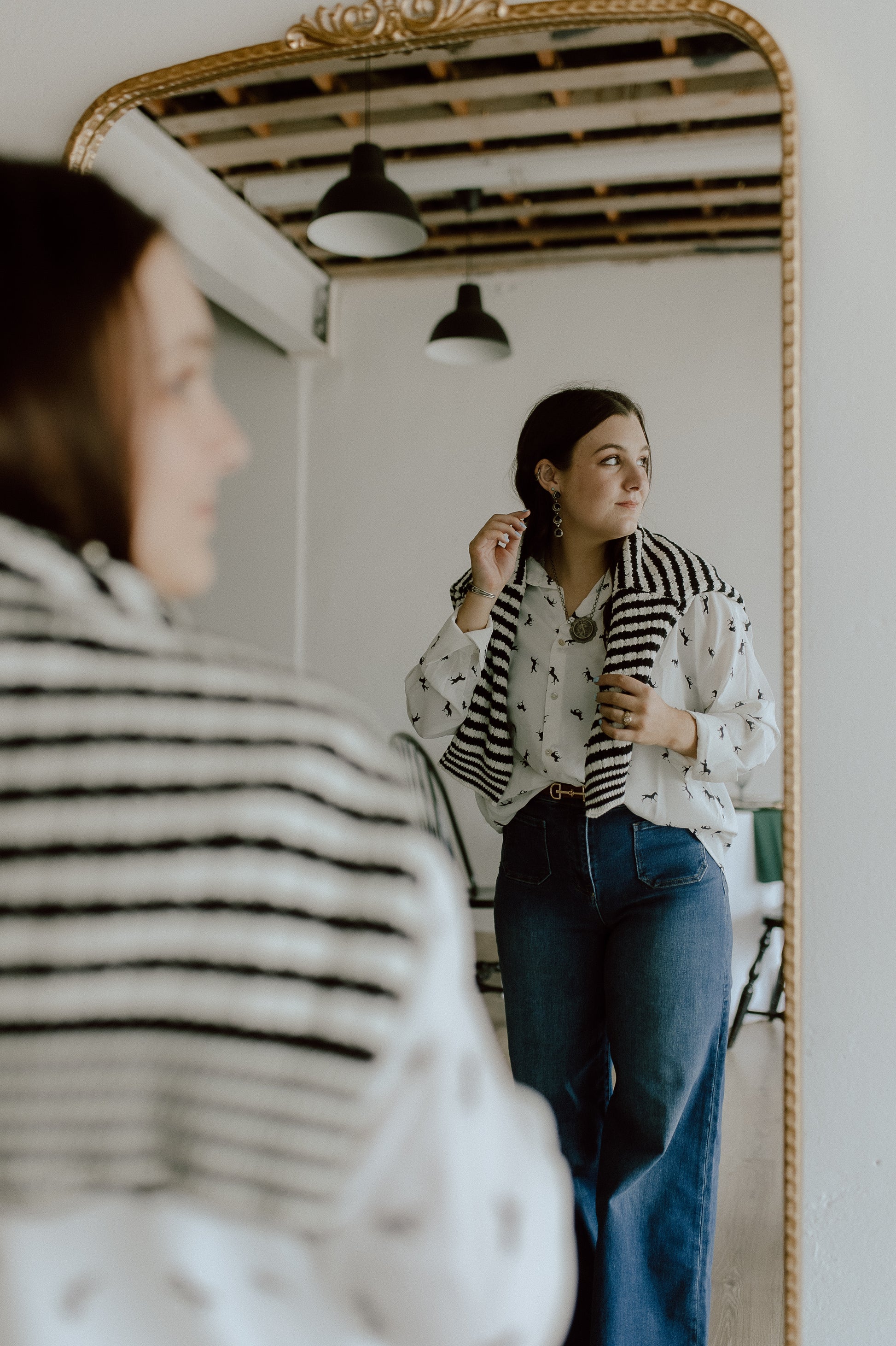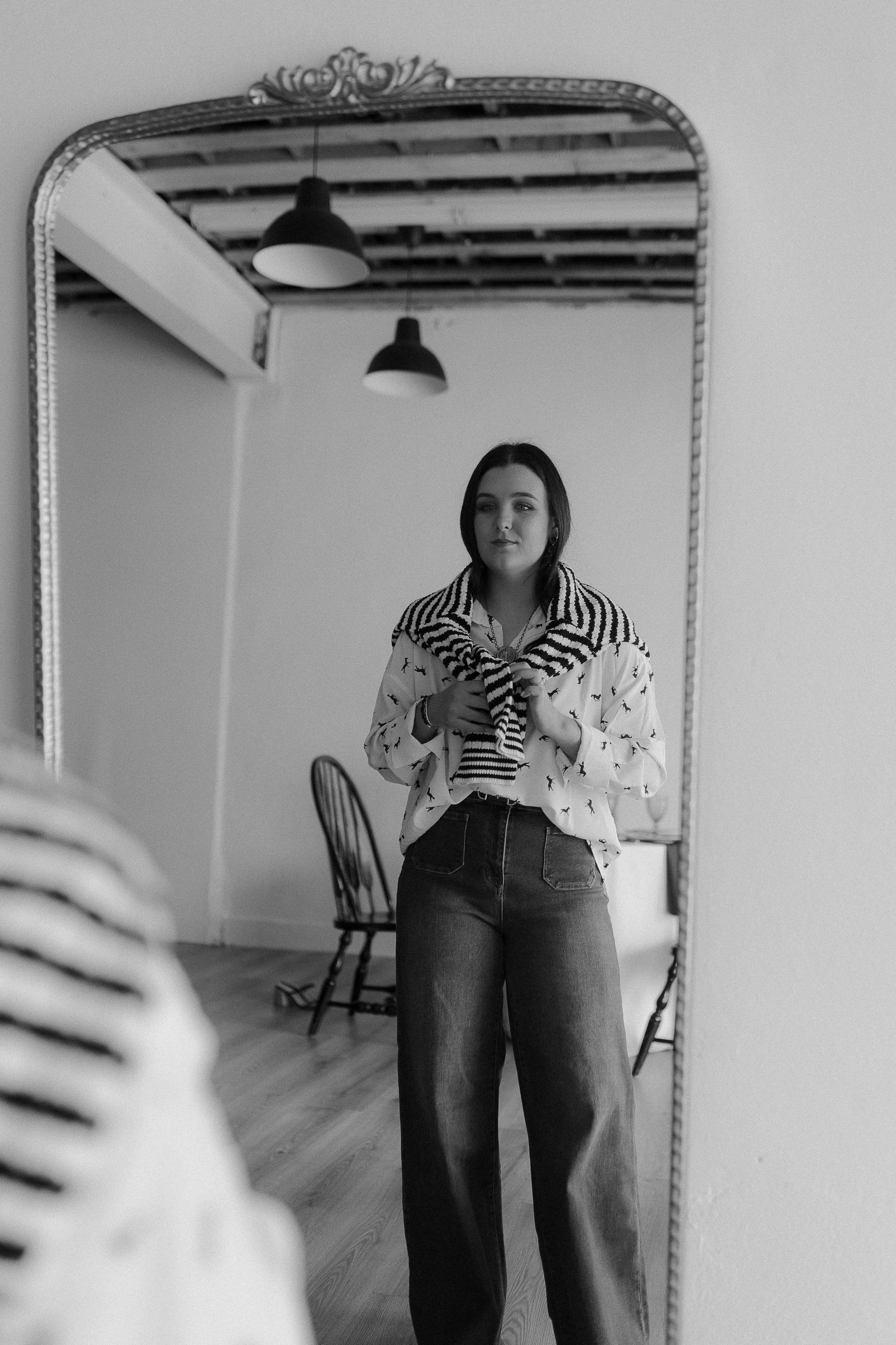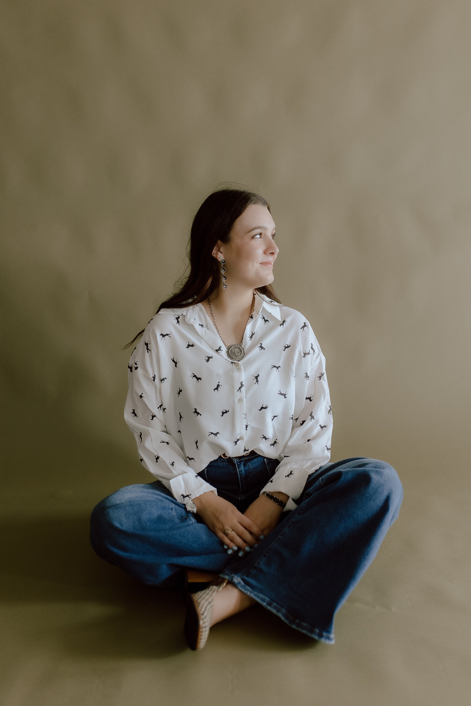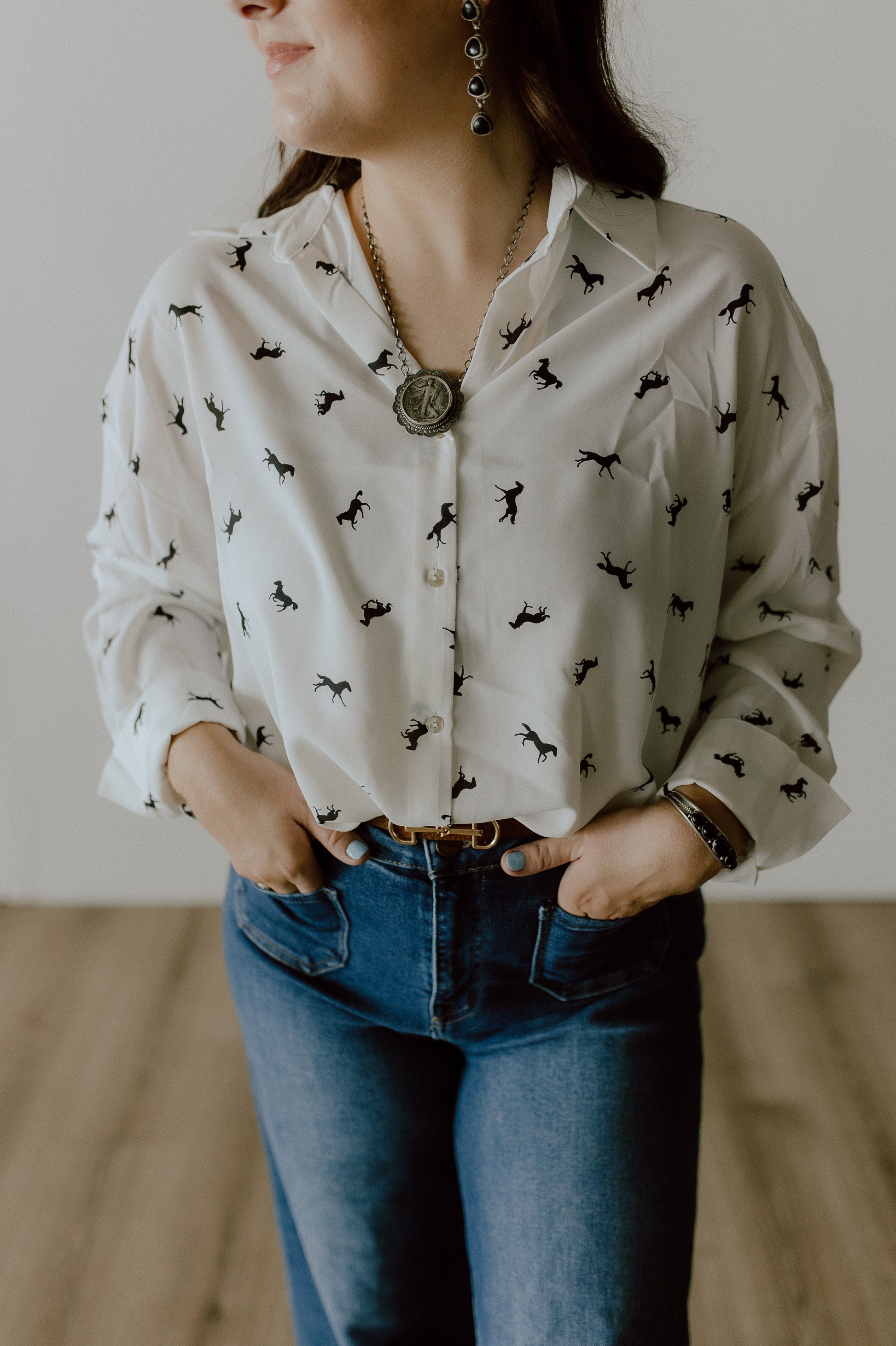 Black and white horse-print button down! So cute and lightweight! It is definitely oversized, so I would stay true to your size or size down for a more fitted look.