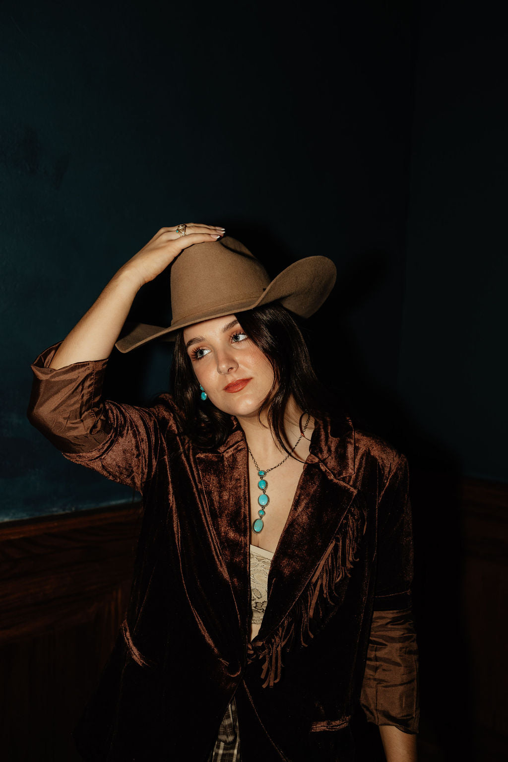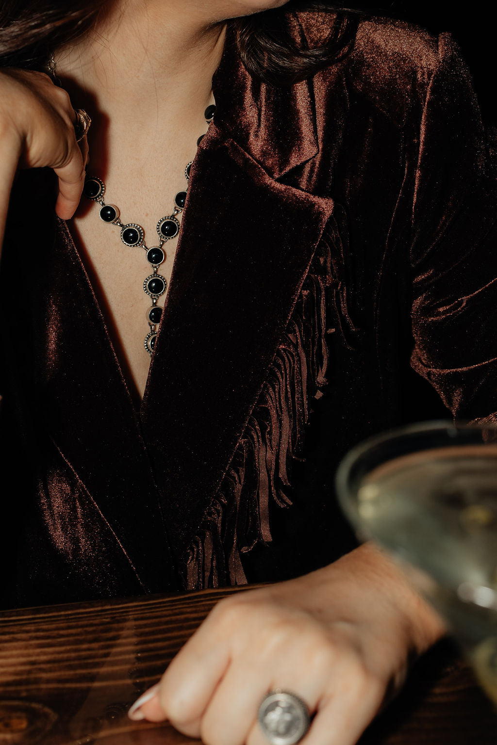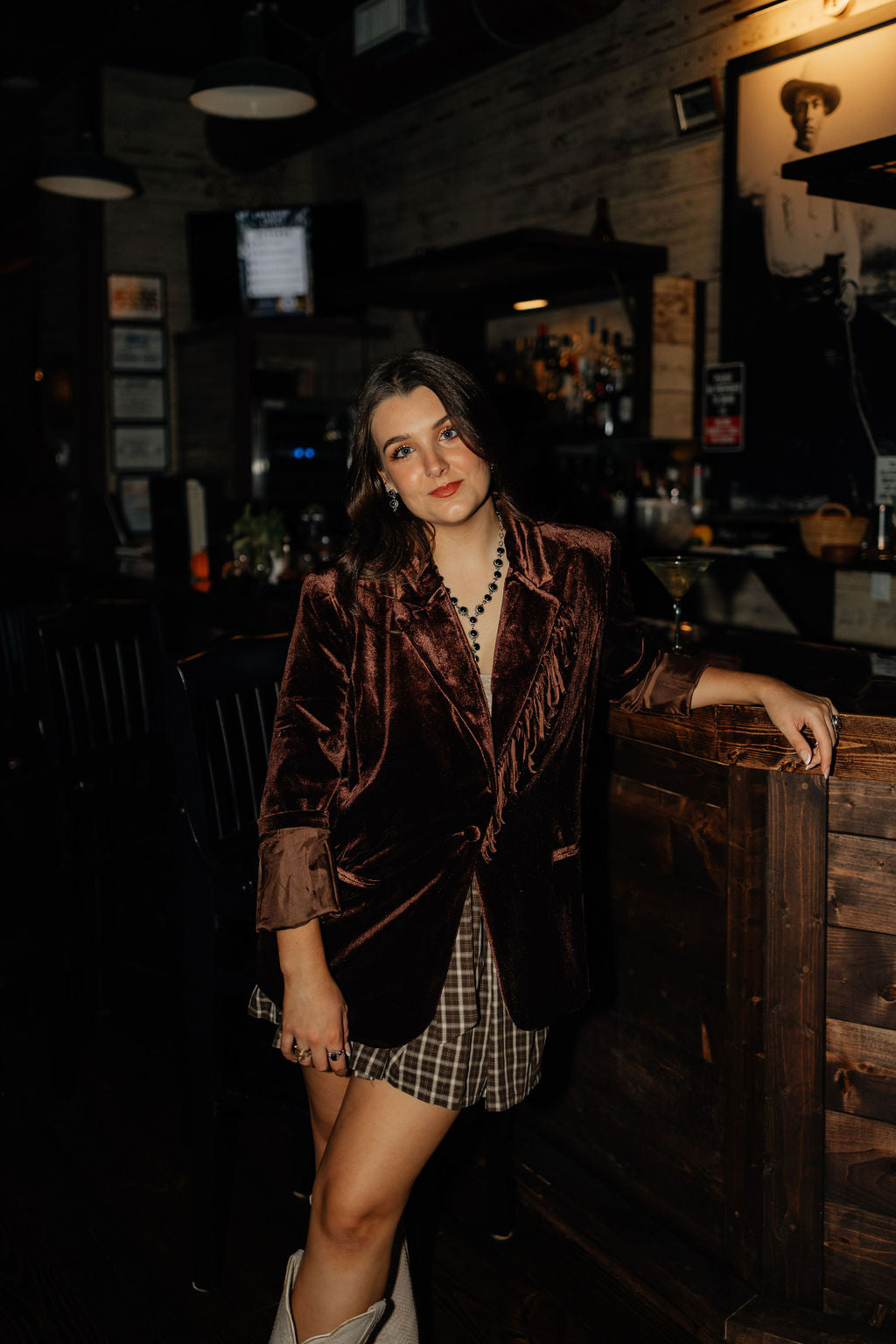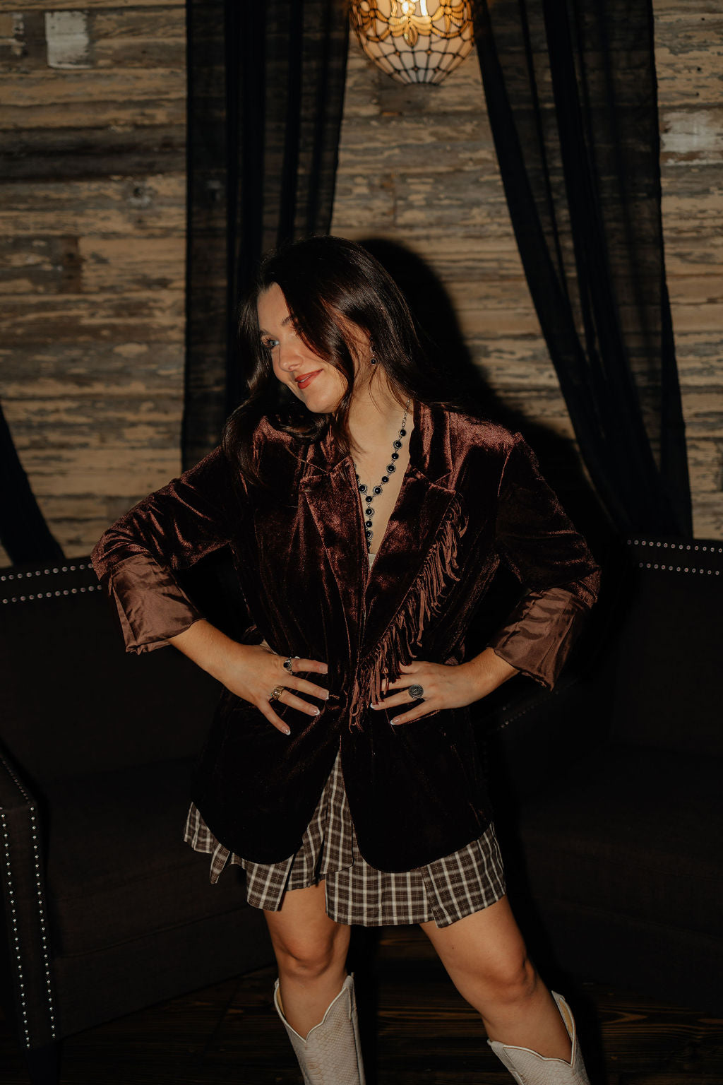 The blazer is SOOO cute! Fringe down one lapel and all over velvet! The prettiest brown and has shoulder pads.